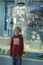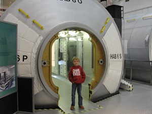 Here Tyler is standing in a node, much like the one that the space shuttle is delivering to the Space Station right now. These giant “coffee can-like” structures are where the cosmonauts eat, sleep, and work in the space station everyday.